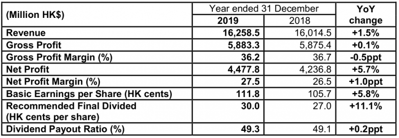 During FY2019, the Group’s revenue climbed by 1.5% to HK$ 16,258.5 million. Gross profit was HK$ 5,883.3 million, similar to the previous year, while gross profit margin stabilised at 36.2%. Net profit of the year increased by 57 to HK$ 4,477.8 million, and net profit margin rose to 27.5%. Basic earnings per share were 111.8 HK cents.