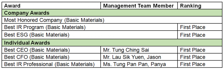 Institutional Investors is one of the most influential publications for global investment firms. The “2020 All Asia Executive Team (Basic Materials) Ranking” compiled by the magazine aims to acknowledge companies and business leaders for steadfastly upholding corporate governance principles and fulfilling environmental and social responsibilities while maintaining high transparency when communicating with investors. This year’s survey covered 1,472 listed companies in Asia across 18 sectors. The winners were selected by polling conducted by nearly 2,532 buy-side and sell-side analysts and fund managers based on nine criteria. These criteria include the accessibility of senior executives; how informative and empowered the IR team is to speak authoritatively on the company's behalf; timely and appropriate financial disclosure; quick and thorough response to requests, integral corporate governance structure, in-depth reports on ESG metrics, etc. The “Most Honored Company” winner must place among the top three in at least two categories selected by buy-side and sell-side investment professionals (including “Best CEO” and “Best CFO”).