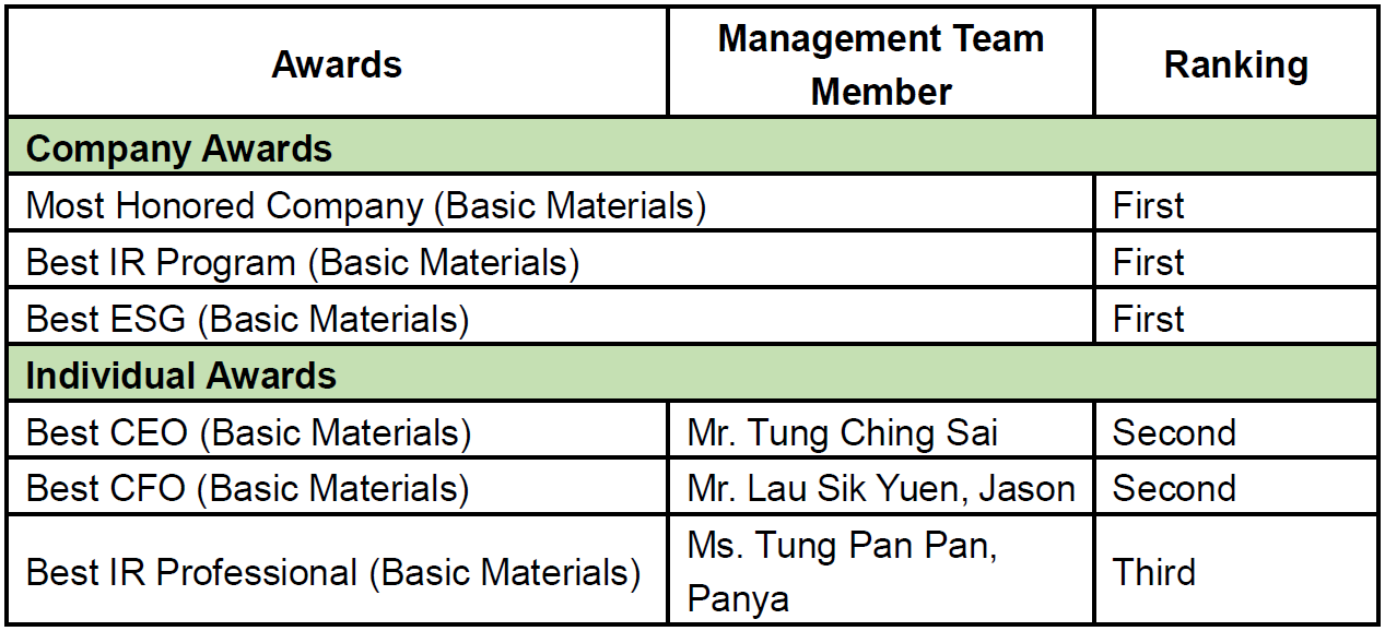 Dr. LEE Yin Yee, B.B.S., Chairman of Xinyi Glass, said, "This year marked the fourth consecutive year for Xinyi Glass to win accolades from Institutional Investor, an outstanding recognition for the Group. Despite restrictions on offline activities this year due to the pandemic, the communications between the Group and investors have never been interrupted. As the vaccination rate rises worldwide, we believe we could communicate in person with investors about the Group’s recent development in the near future. Going forward, the Group intends to continue using diverse channels to communicate in order to strengthen its relations with investors. With regard to ESG, the Group has stepped up efforts in exploring green finance in recent years, aiming to further expand its financing channels through green financing, while contributing to the creation of green and energy-saving society. The Group has secured a total of HK$5.6 billion of green loans from a number of banks since 2019. In the future, the Group will continue maintaining the highest standards of corporate governance and aligning its sustainable development strategies as it strives for good business results to reward investors for their support."